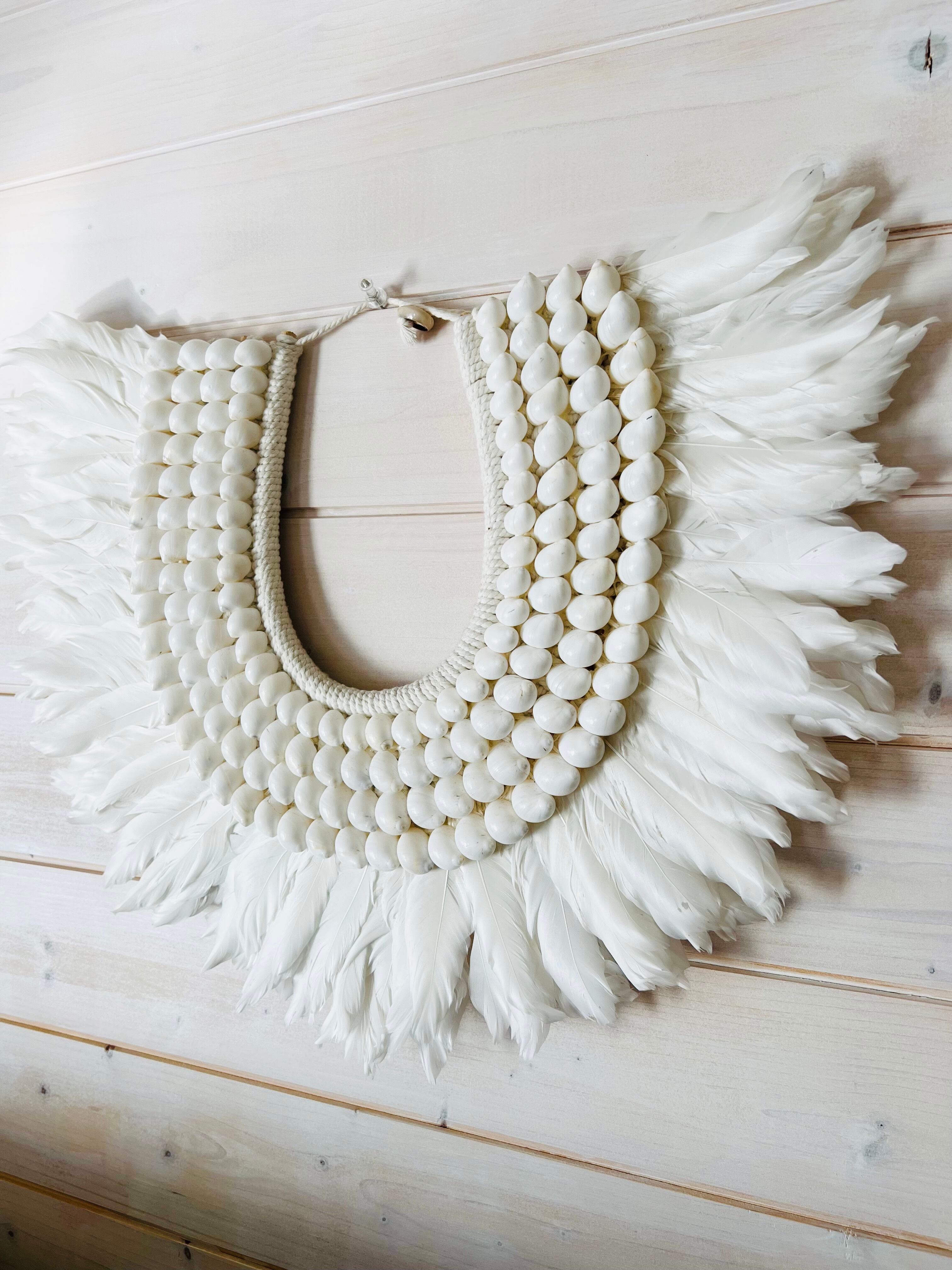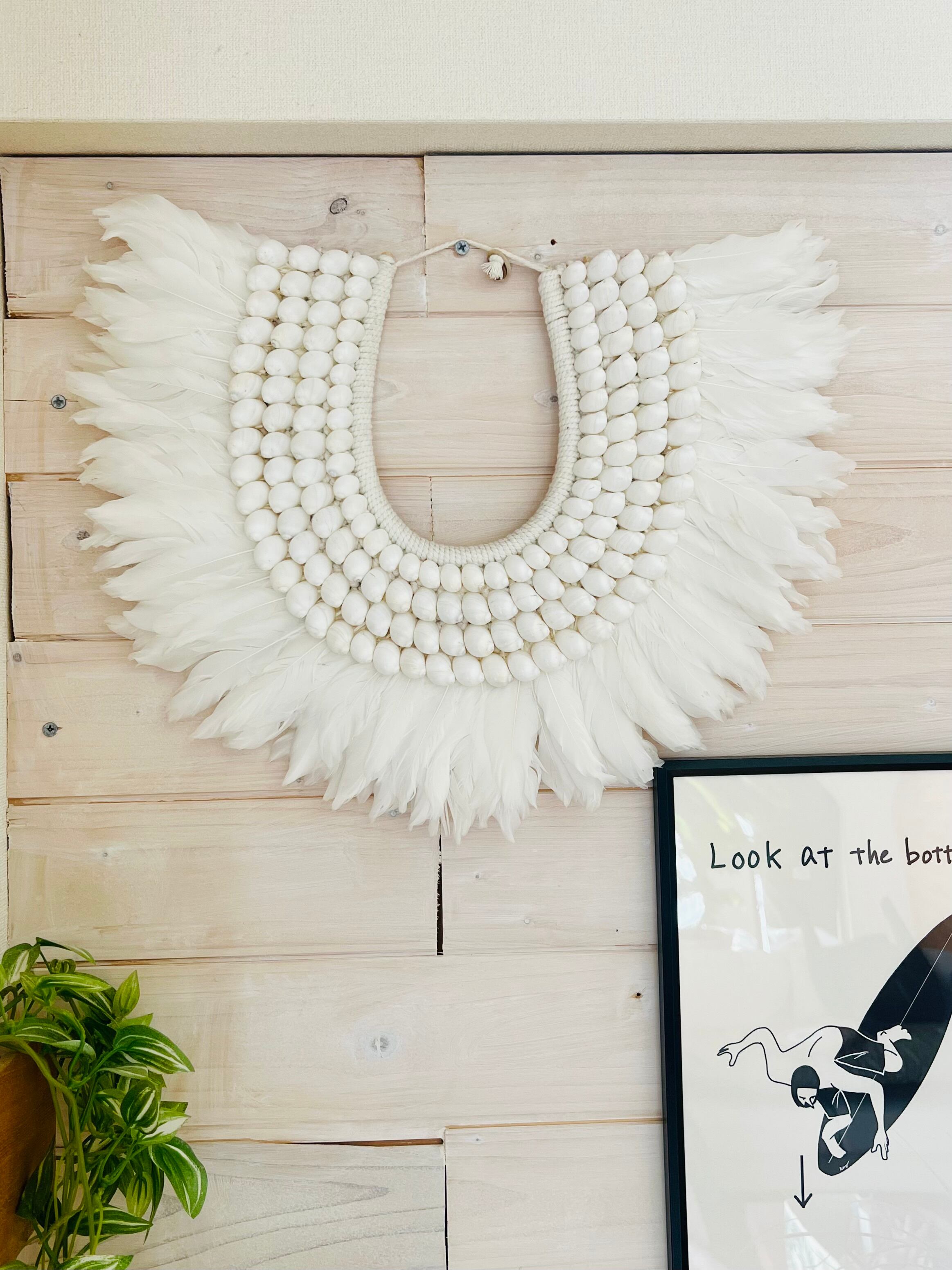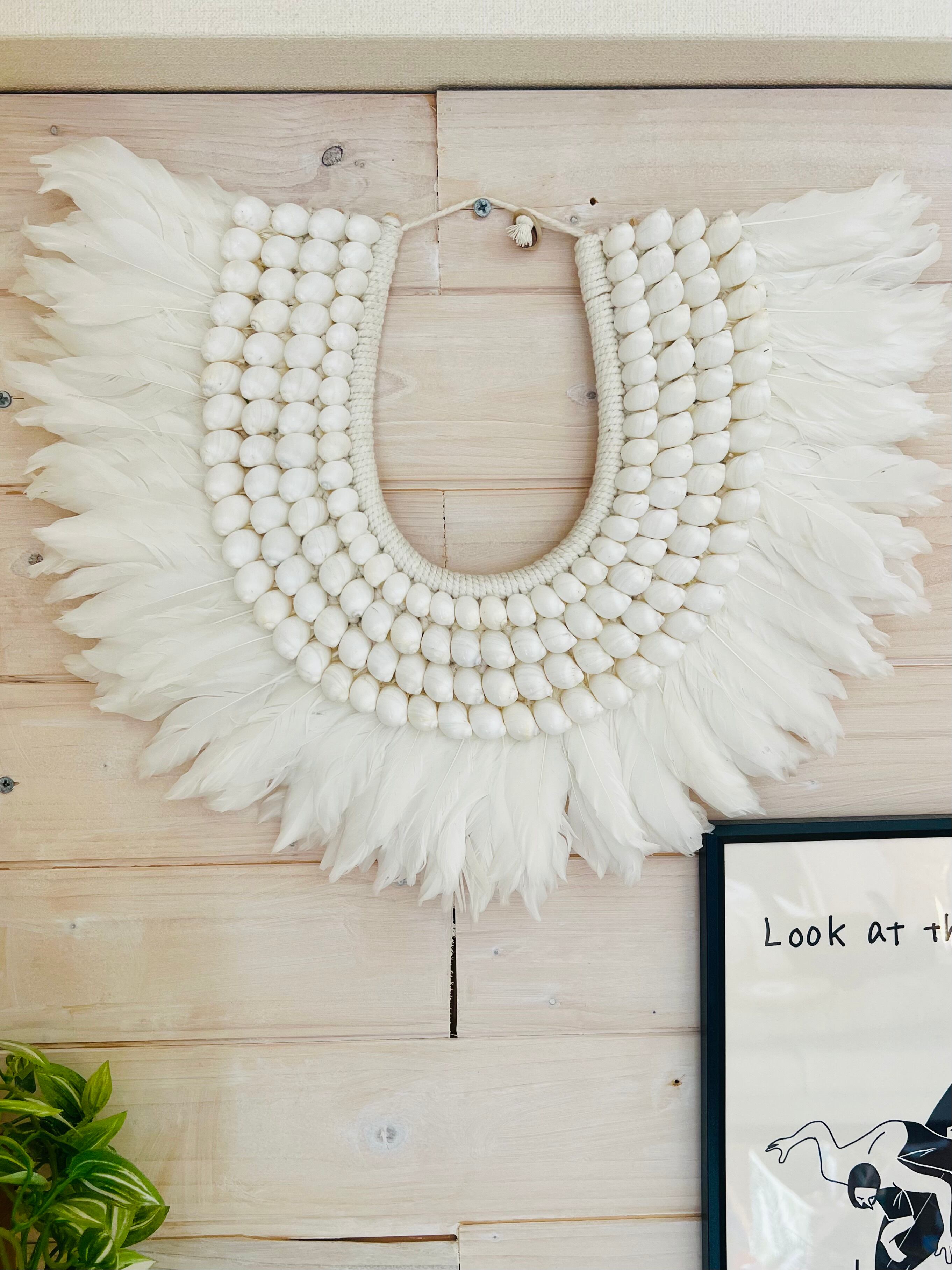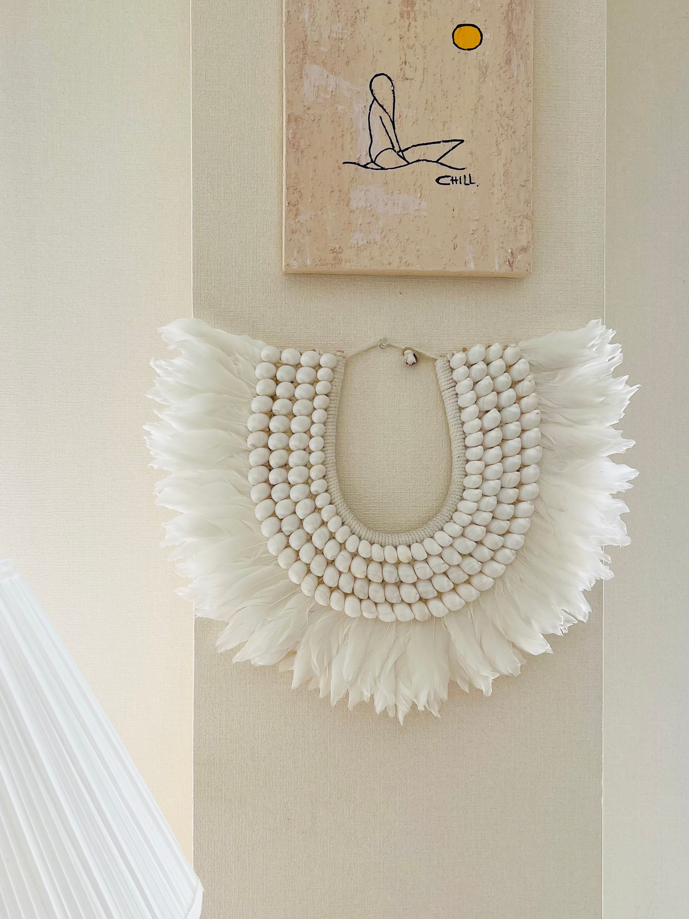 このタペストリーは、フェザーとシェルという自然素材を使い、心を癒す温かみを体感できます。柔らかなフェザーの質感と、シェルの独特な輝きが、お部屋を南国のリゾートのような雰囲気に包み込んでくれます。