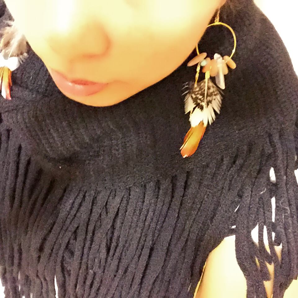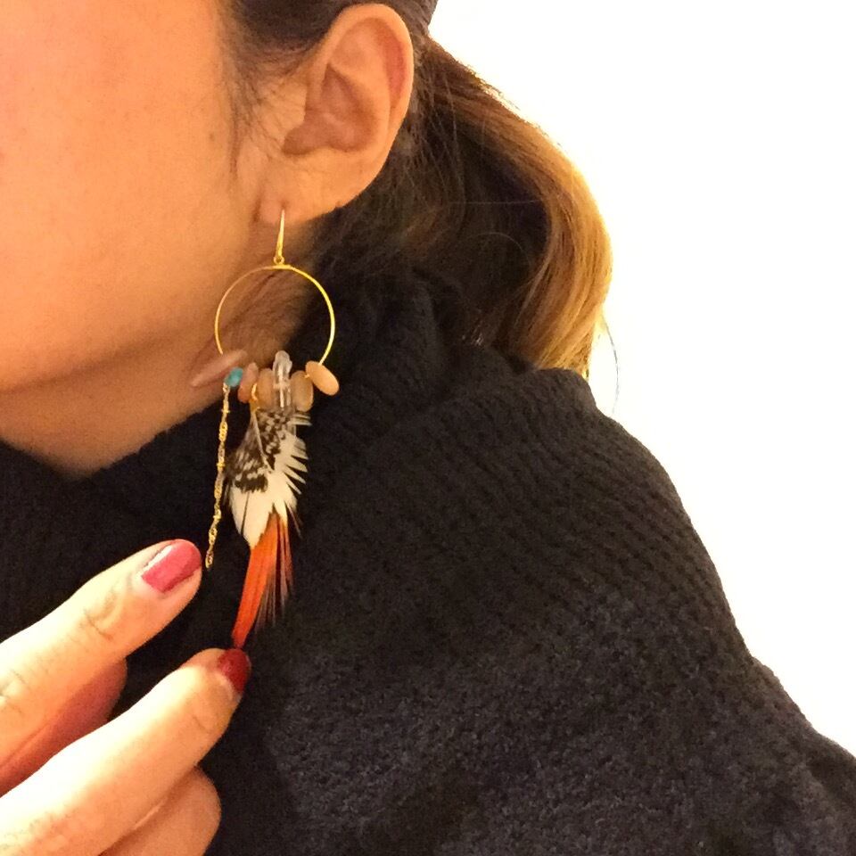 フェザーにターコイズやオレンジムーンストーン、クリスタルのストーンでボヘミアンスタイルを演出♡
