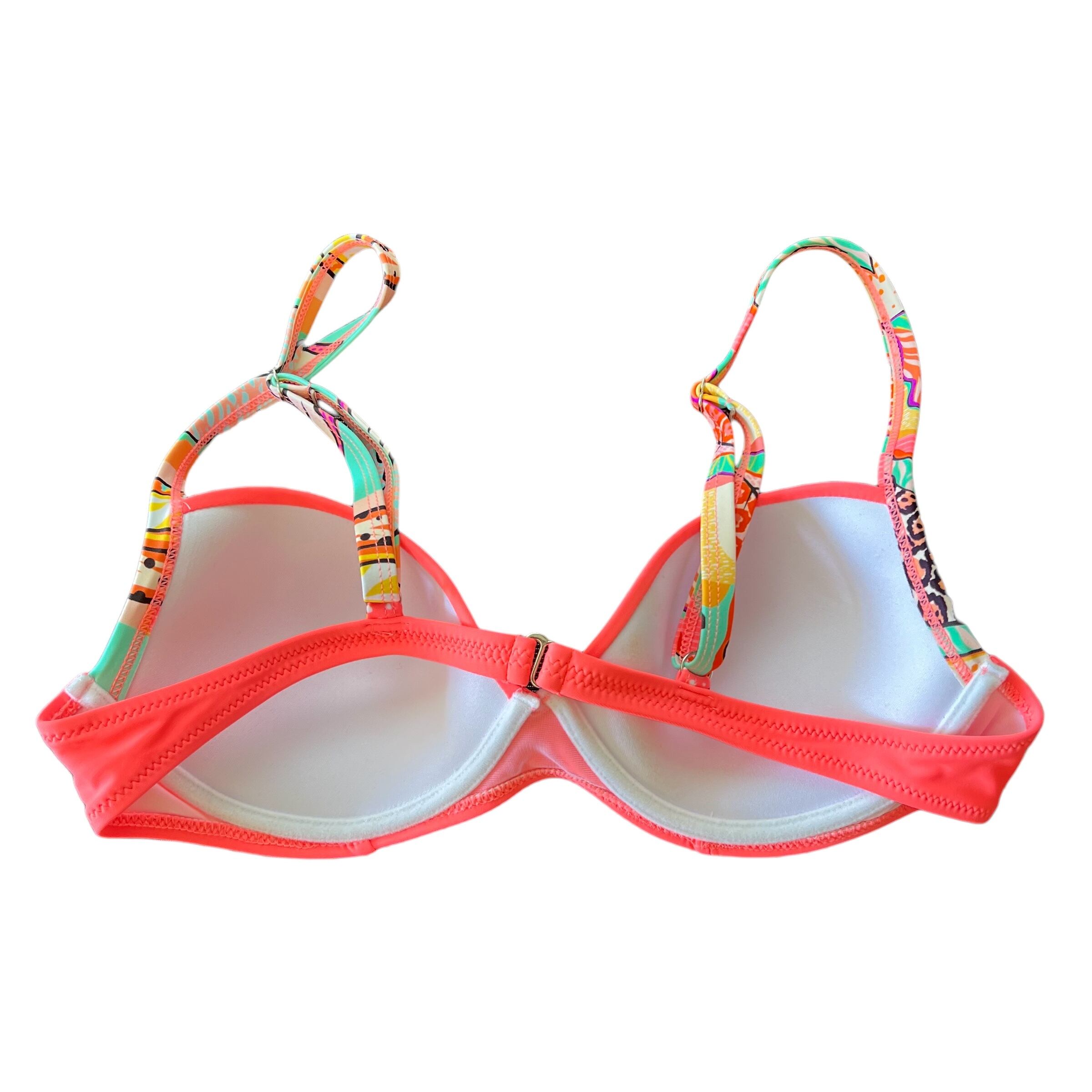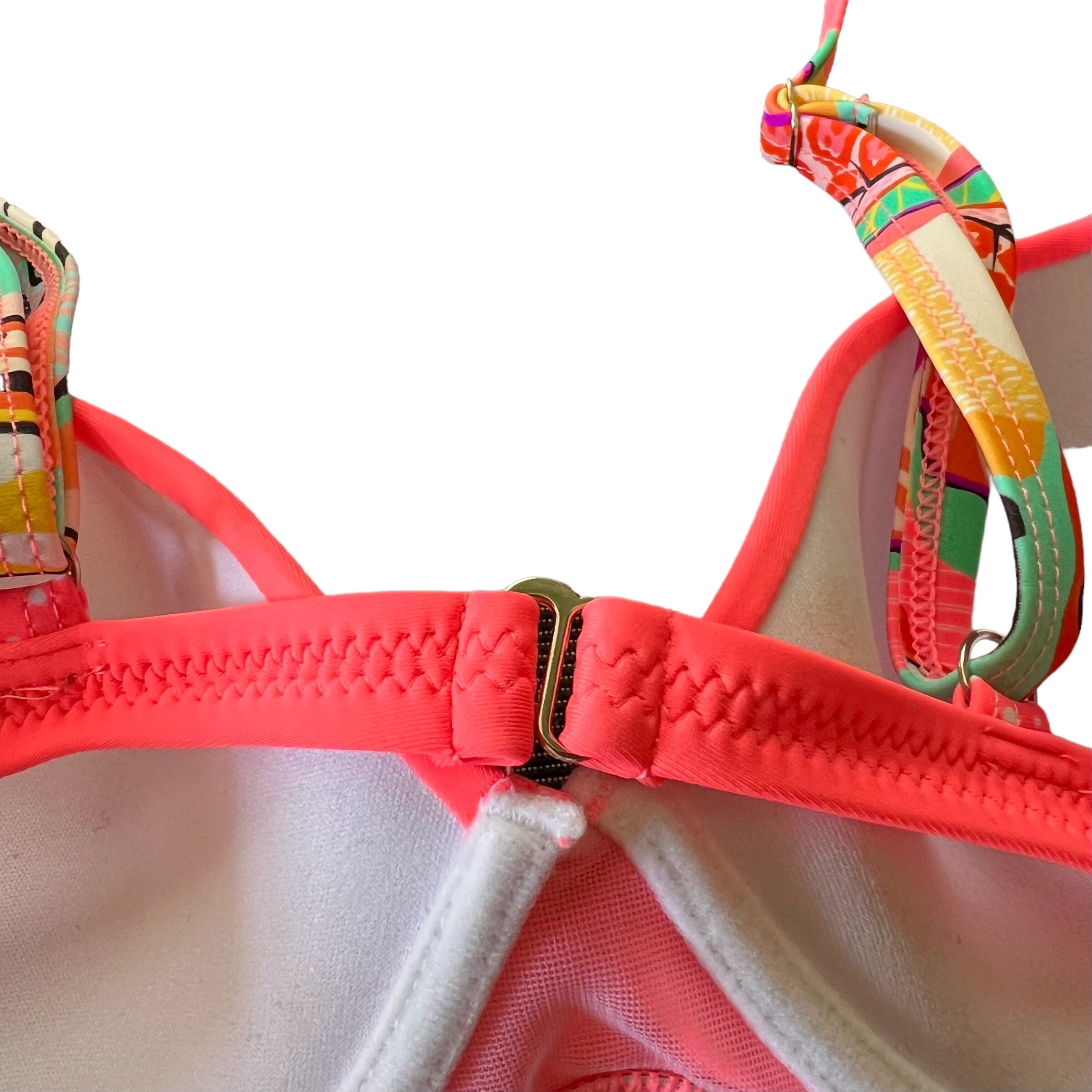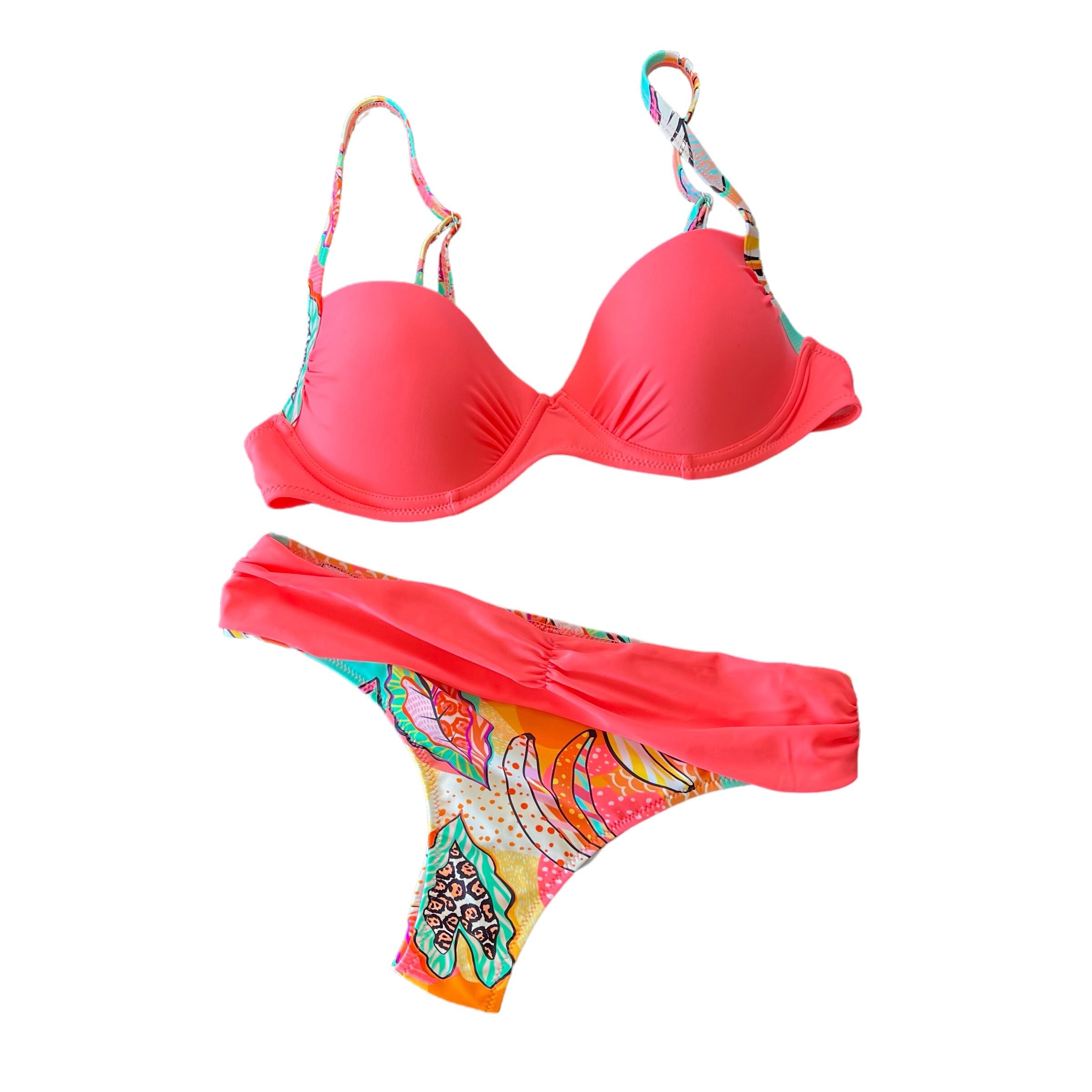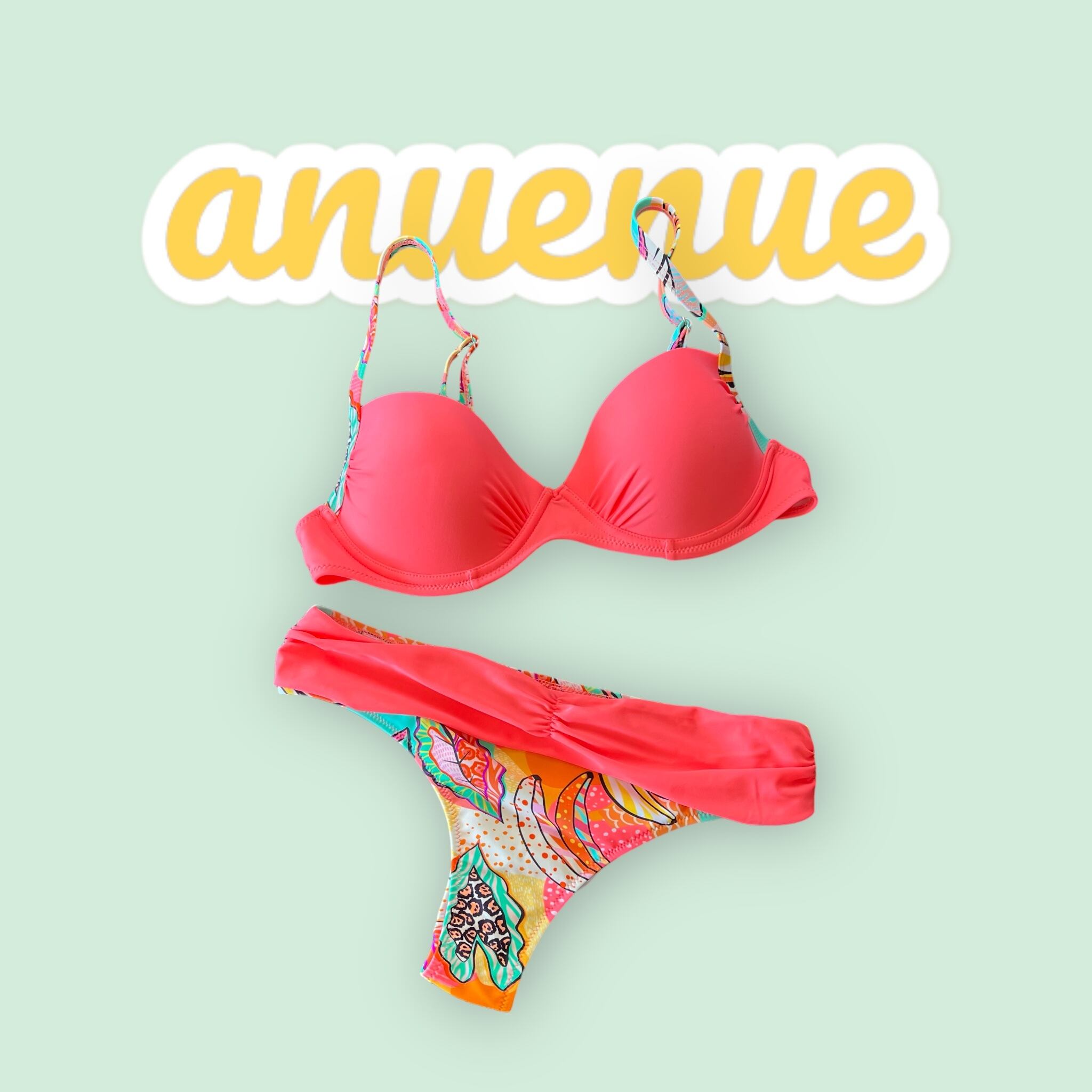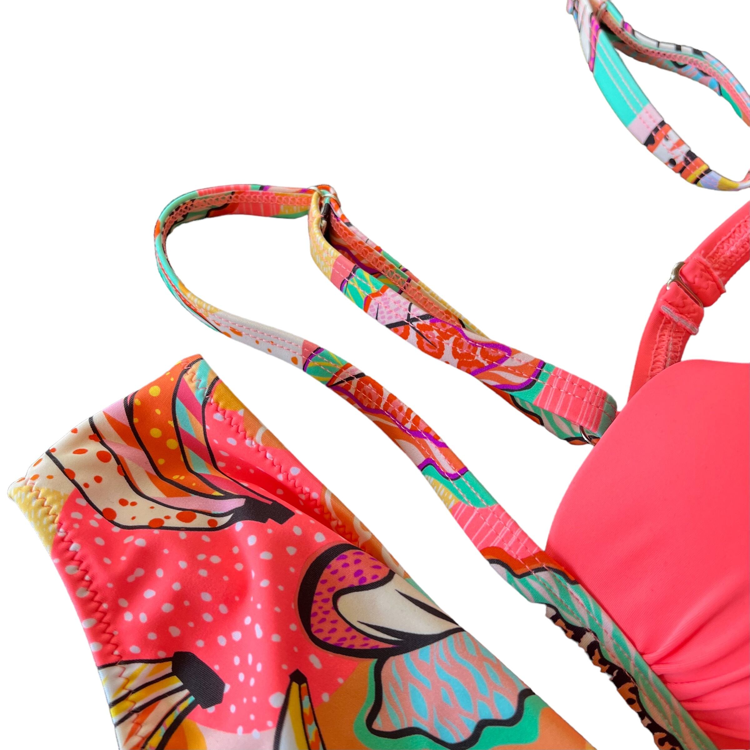 ネオンピンクと南国フルーツのデザインが可愛いビキニです!